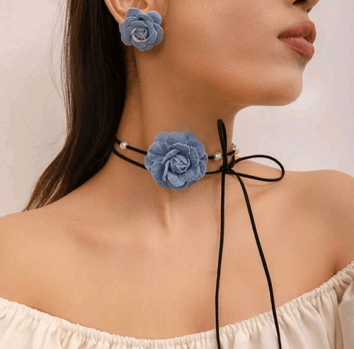 (Denim, Black available) 3pcs Vintage Cowgirl Style Jeans & Rose Flower Necklace Earrings Set