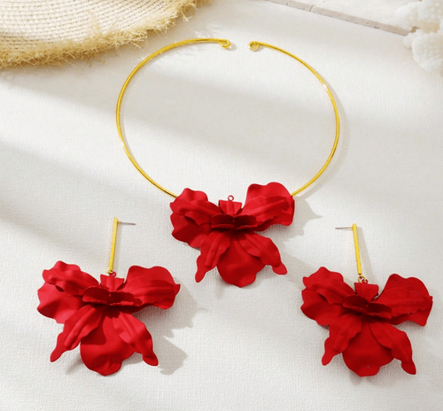 Red 3D Floral Earrings & Necklace Jewelry Set